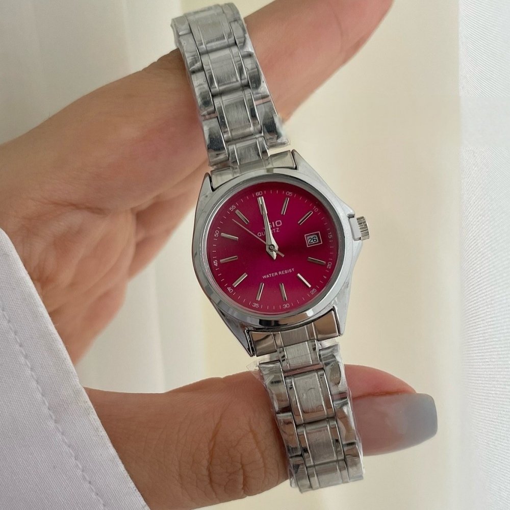- ساعت زنانه عقربه ای کاسیو CASIO صفحه گرد قرمز بند استیل نقره ایی ضدآب+باطری اضافی کد 9465