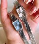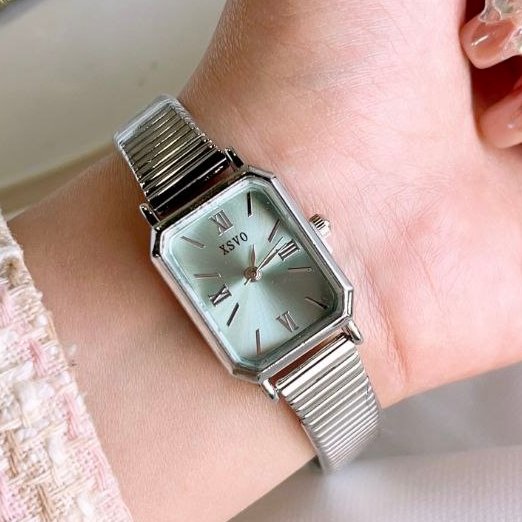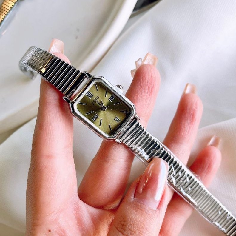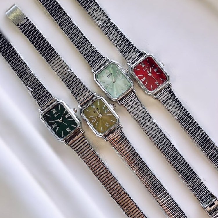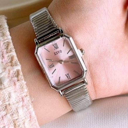 - ساعت مچی زنانه بند استیل نقره ایی قفل ریلی طرح یونانی زنونه ایکس وی Xsvo صفحه نمایش مستطیلی صورتی+باطری اضافی کد9495