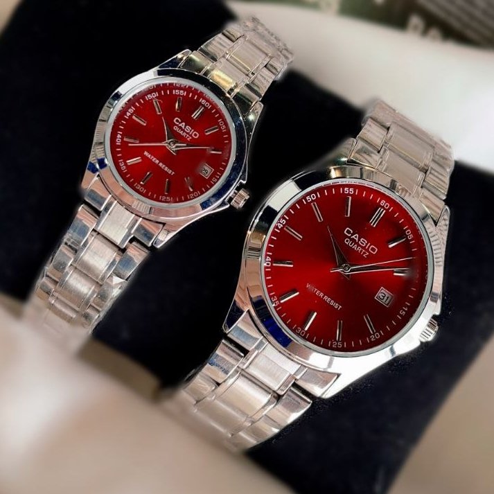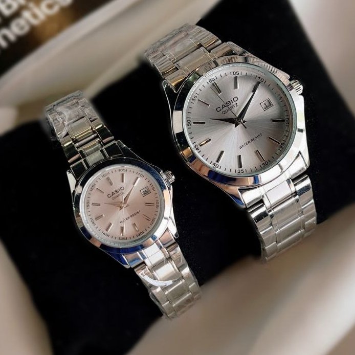 - ساعت ست و تکی زنانه و مردانه عقربه ای کاسیو CASIO صفحه گرد مشکی بند استیل نقره ایی - تک+باطری اضافی کد 9509