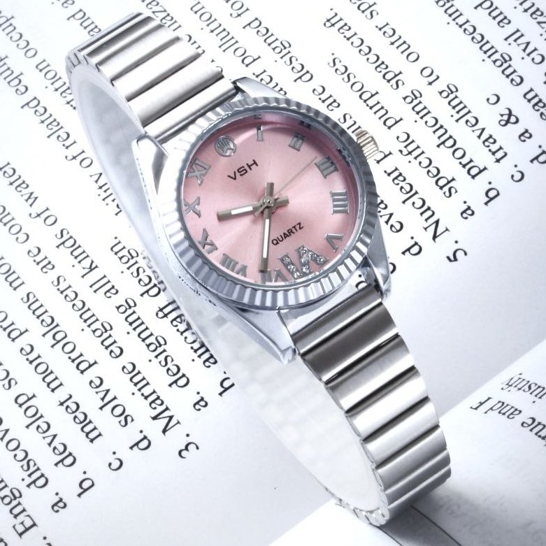 - ساعت مچی زنانه Vsh بند استیل نقره ایی ریلی صفحه نمایش گرد صورتی+باطری اضافی کد9513