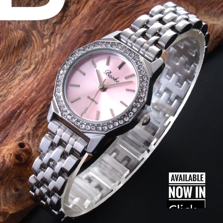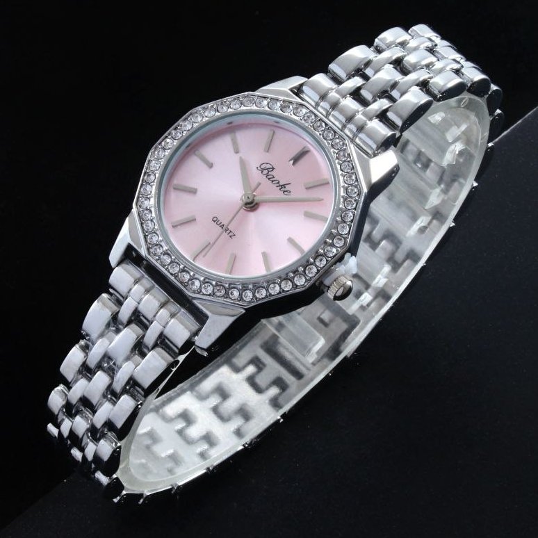 - ساعت مچی زنانه Baoke بند استیل نقره ایی دور نگین صفحه صورتی+باطری اضافی کد9585