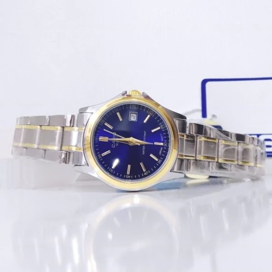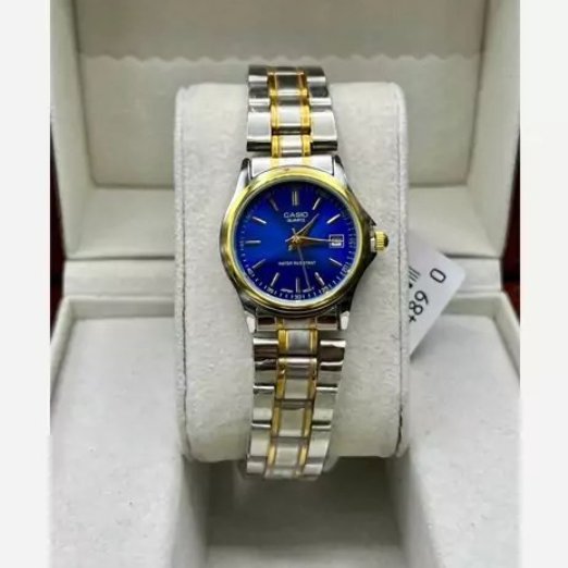 - ساعت مچی زنانه عقربه ای کاسیو CASIO صفحه گرد آبی بند استیل دو رنگ طلایی نقره ایی - تک کد 27290