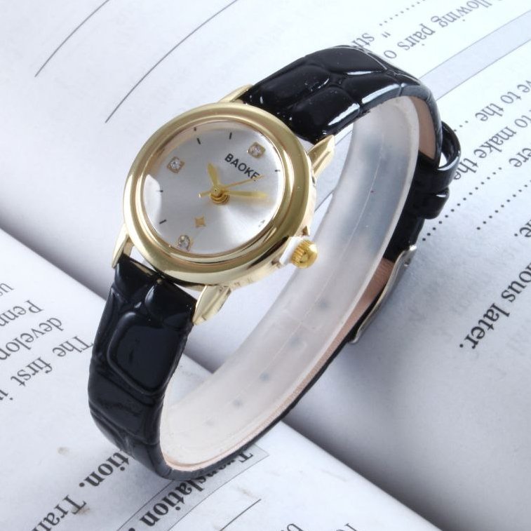 - ساعت مچی زنانه و دخترانه مینیمال بند چرم Baoke مشکی صفحه نمایش ظریف فانتزی دور طلایی+باطری اضافی کد9657