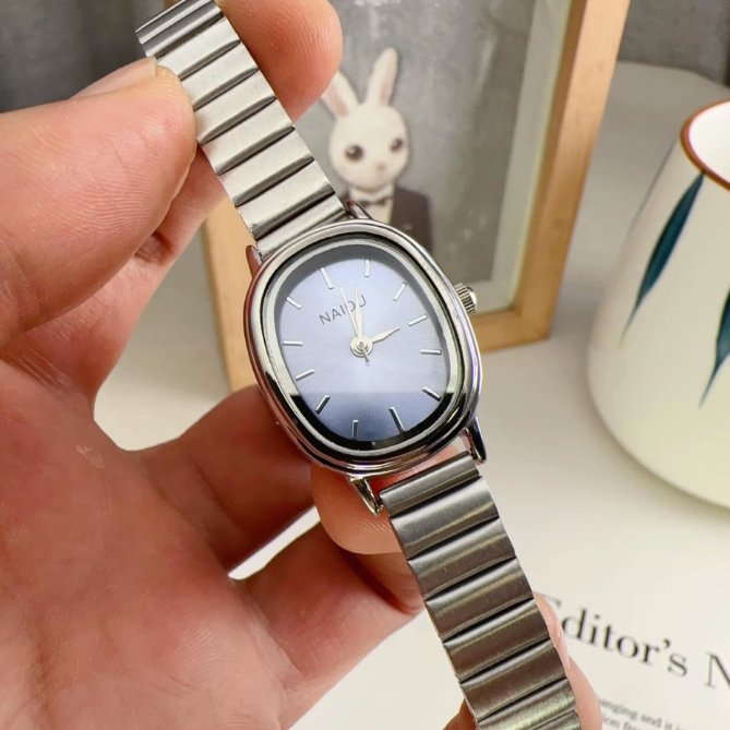 - ساعت مچی زنانه نایدو NAIDU صفحه بیضی یونانی مشکی بند ریلی(کرکره ایی ) استیل+باطری اضافی کد 9740
