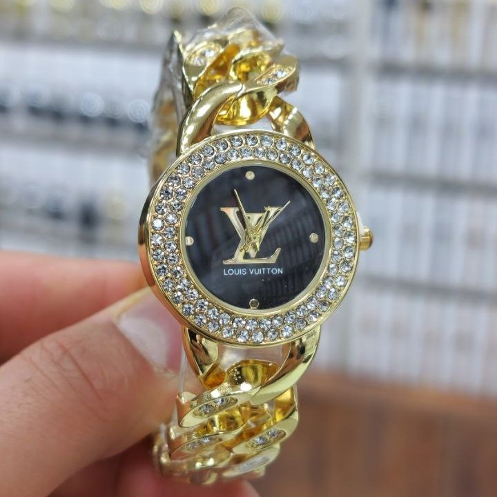 - ساعت مچی زنانه برند لویی ویتون بند استیل نقره ایی کارتیر(زنجیری) نگین دارمجلسی سفید+باطری اضافی کد9771
