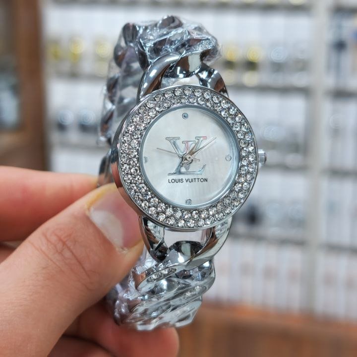 - ساعت مچی زنانه برند لویی ویتون بند استیل نقره ایی کارتیر(زنجیری) نگین دارمجلسی مشکی+باطری اضافی کد9772