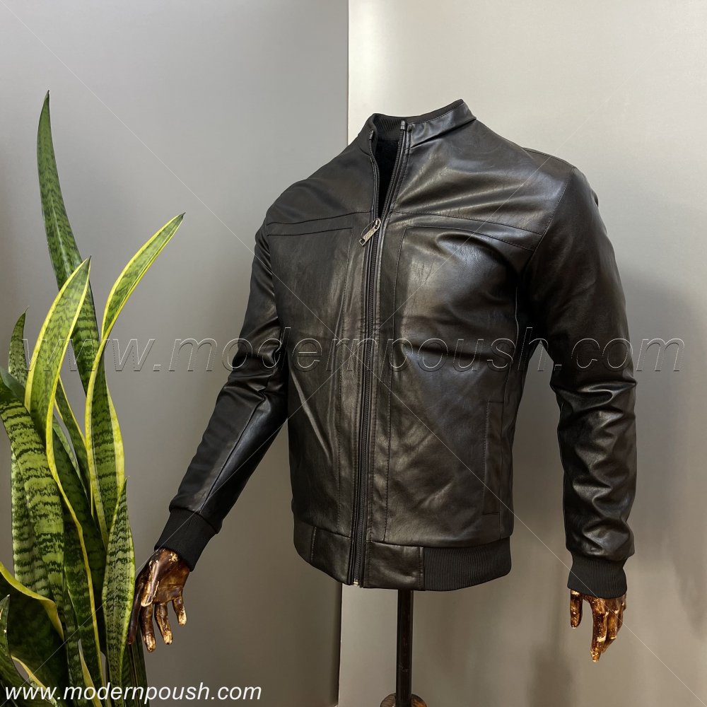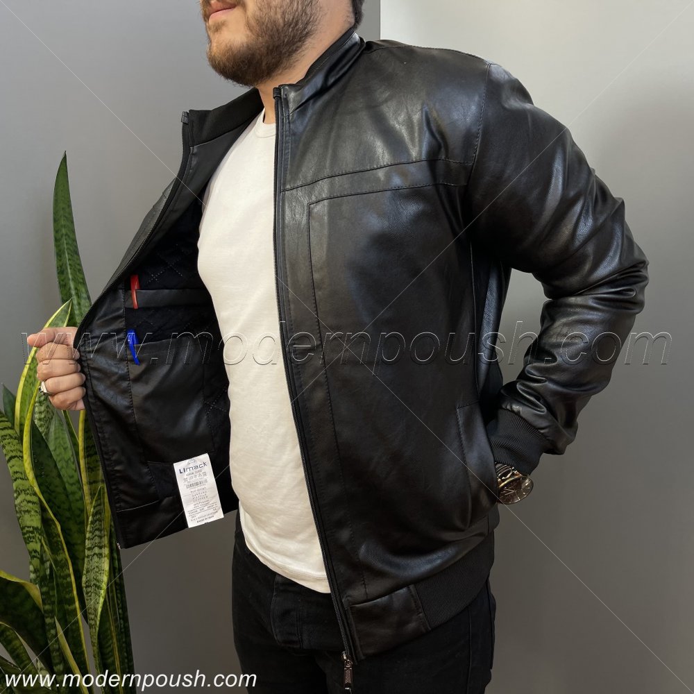 کاپشن زمستانه چرم مردانه رنگ مشکی پشم شیشه دار کد 970023