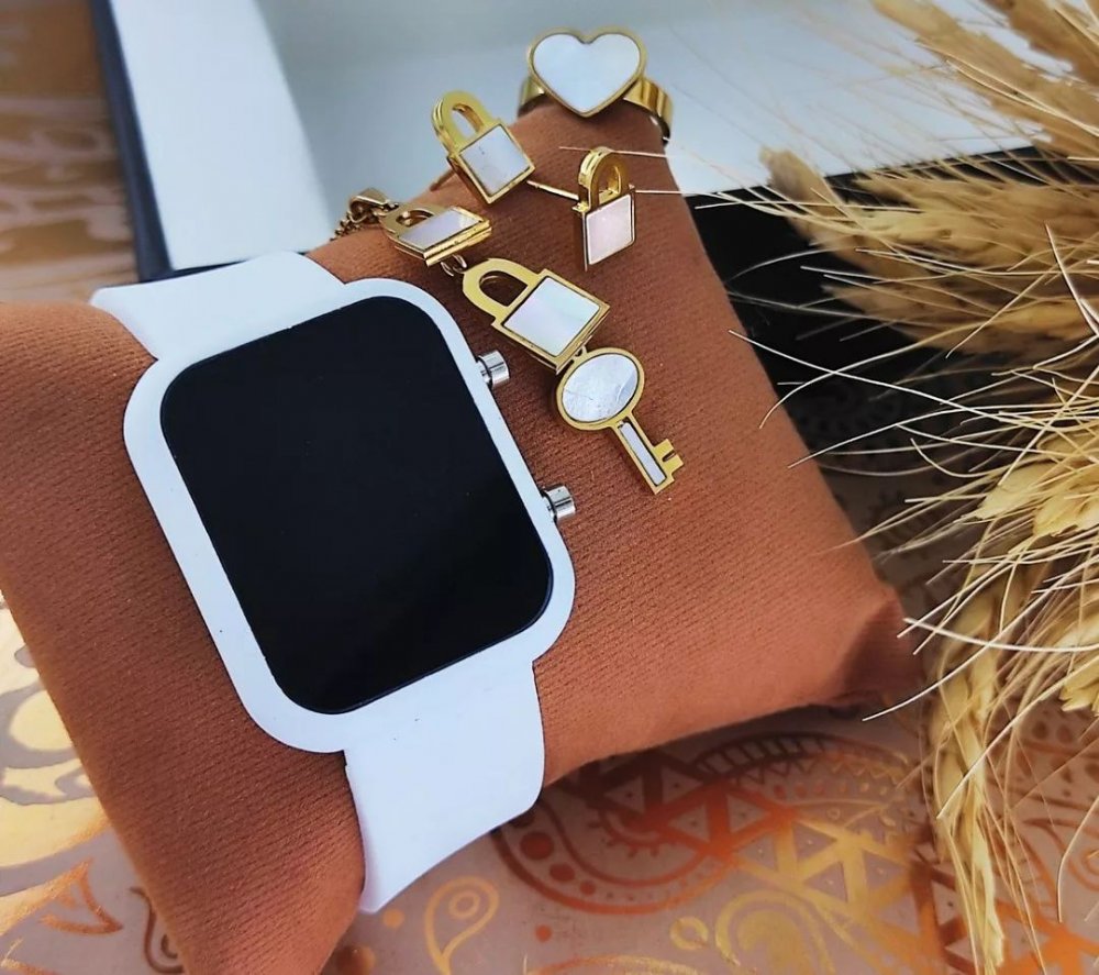 این ساعت مچی LED مشابه ساعت apple watch طراحی شده و سعی شده از نظر ظاهری با آن ساعت، شباهت کامل داشته باشد. میتوانید ساعتی مشابه اپل واچ داشته باشید؛ البته با امکانات کمتر و قیمتمناسبتر. این ساعت دارای تقویم روز شمار و جعبه شکیل است و در حالت عادی دارای صفحهی خاموش است.