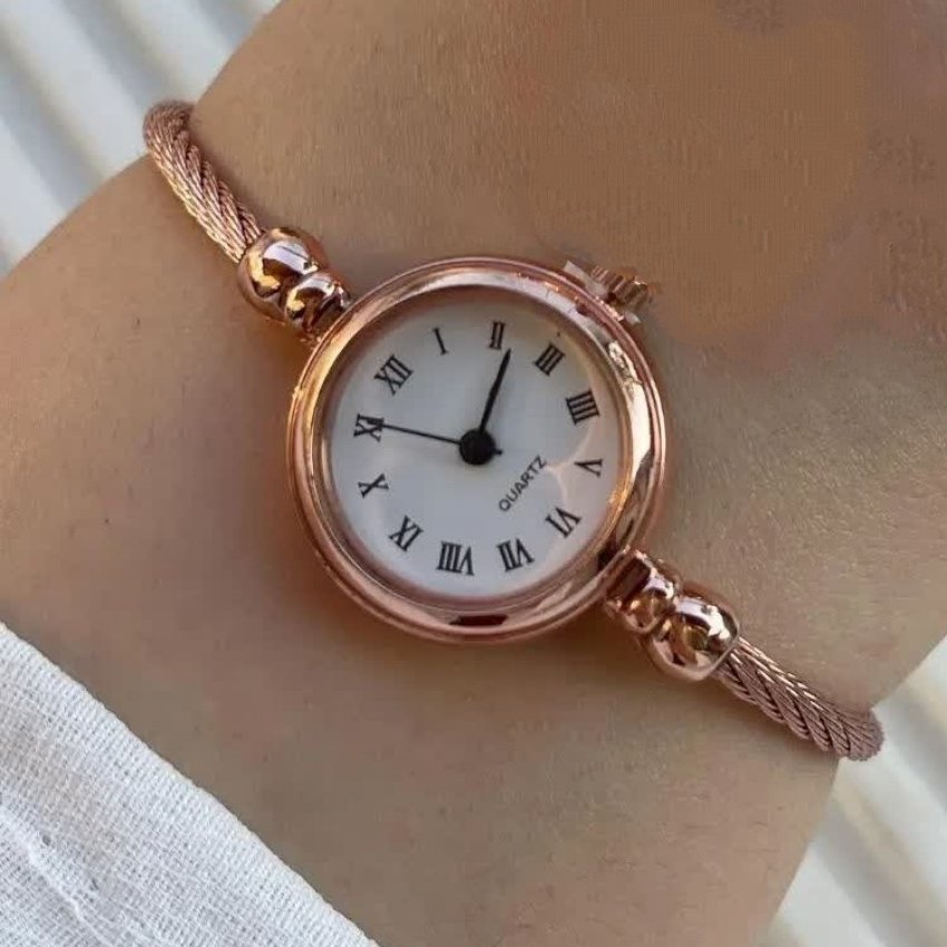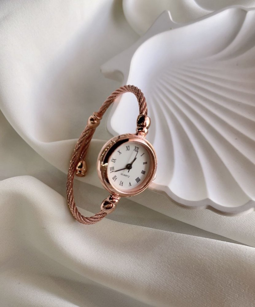 - ساعت مچی زنانه صفحه نمایش سفید بند رزگلد طرح دستبندی النگویی بنگل +باطری اضافی کد1474