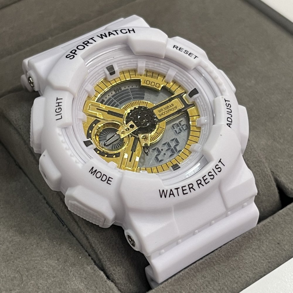- ساعت (دو زمانه) کرنومتر دار الارم دار طرح جی شاک بند سفید صفحه طلایی+باطری اضافی کد 1480
