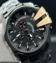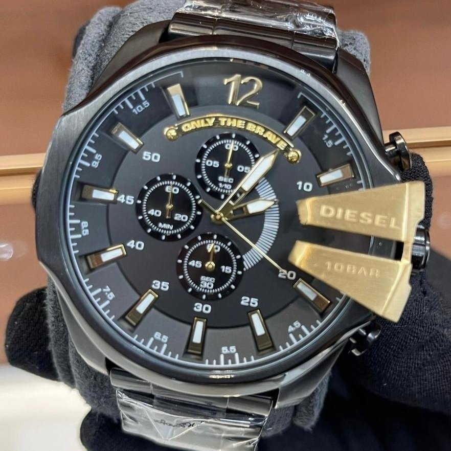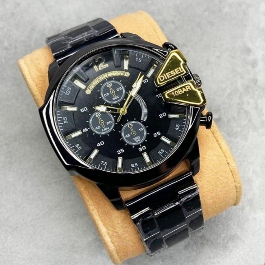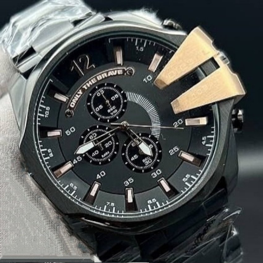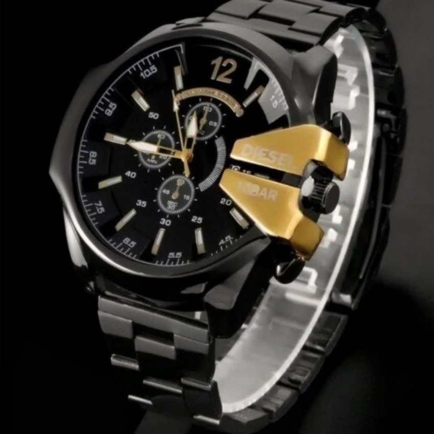 - ساعت دیزل شاخدار قاب و بند استیل صفحه و بند و قاب مشکی، شاخ طلایی صفحه بزرگ تقویم دار+باطری اضافی کد1900